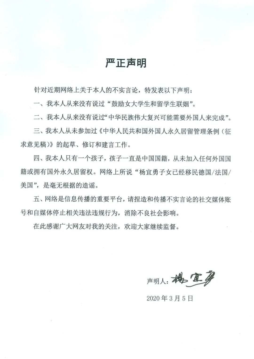 四、我本人只有一个孩子,孩子一直是中国国籍,从未加入任何外国国籍或拥有国外永久居留权。网络上所说‘杨宜勇子女已经移民德国/法国/美国’,是毫无根据的造谣。