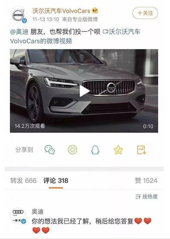 沃尔沃就在微博上@奥迪,“朋友,也帮我们投一个呗”。奥迪在这条微博下面评论“你的想法我已经了解,稍后给您答复”。